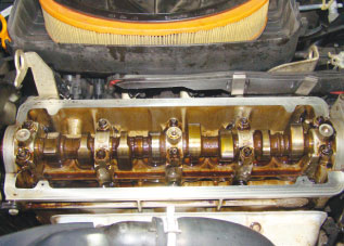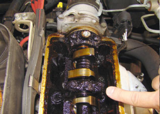 Para nossa surpresa, a luz indicadora de pressão de óleo demorou cerca de 10 segundos para acender (lembre-se, o motor já estava desligado). Repetimos o teste por três vezes e o fato se repetiu da mesma forma. Isso demonstrou que as galerias de óleo do bloco do motor estavam consideravelmente obstruídas (por borra), impedindo o retorno ao cárter. No caso da galeria que alimenta o interruptor de pressão do óleo (a famosa cebolinha), era nítido o acúmulo de impurezas. Por último removemos a tampa de válvulas, uma vez que a tampa de abastecimento de óleo já havia indicado acúmulo de borra.